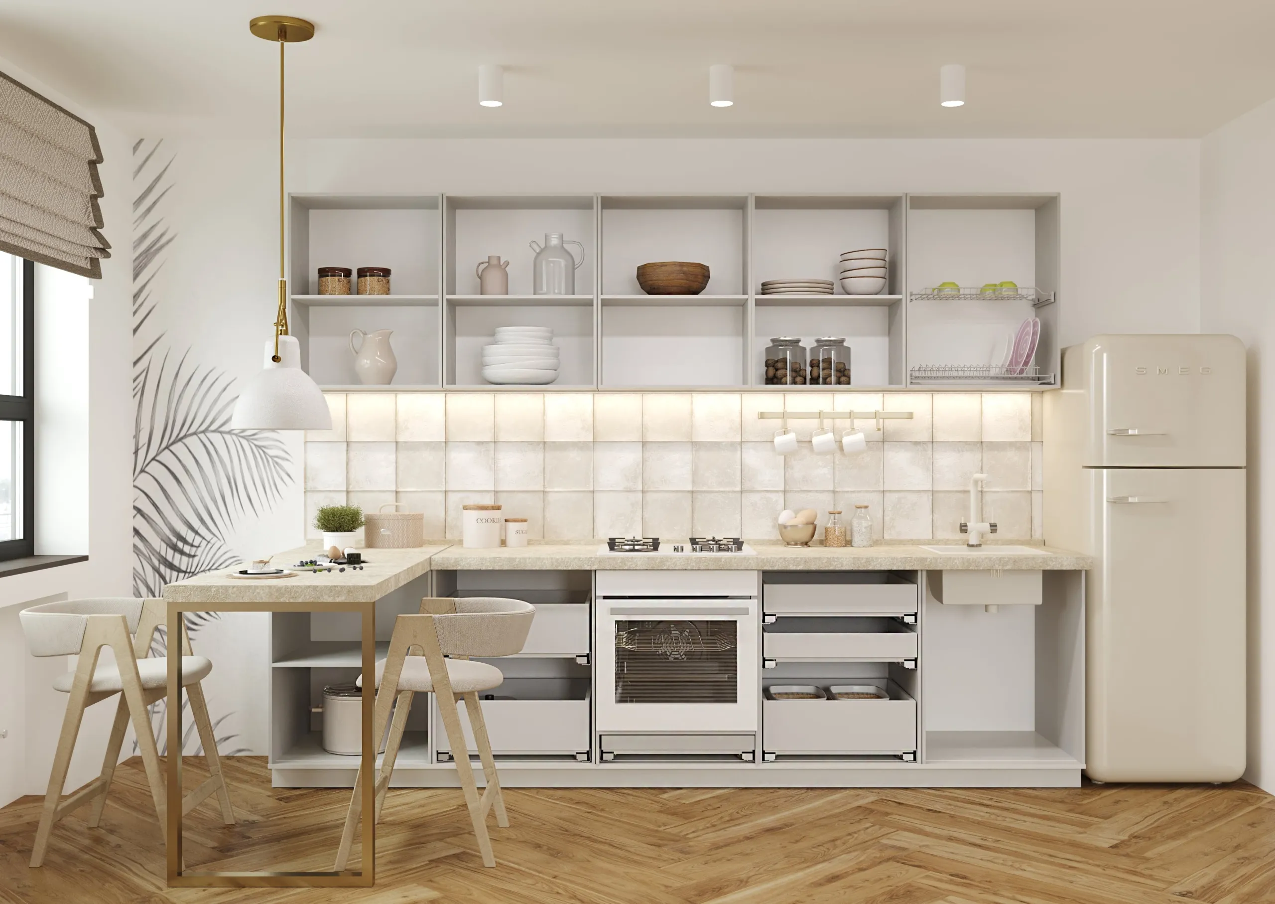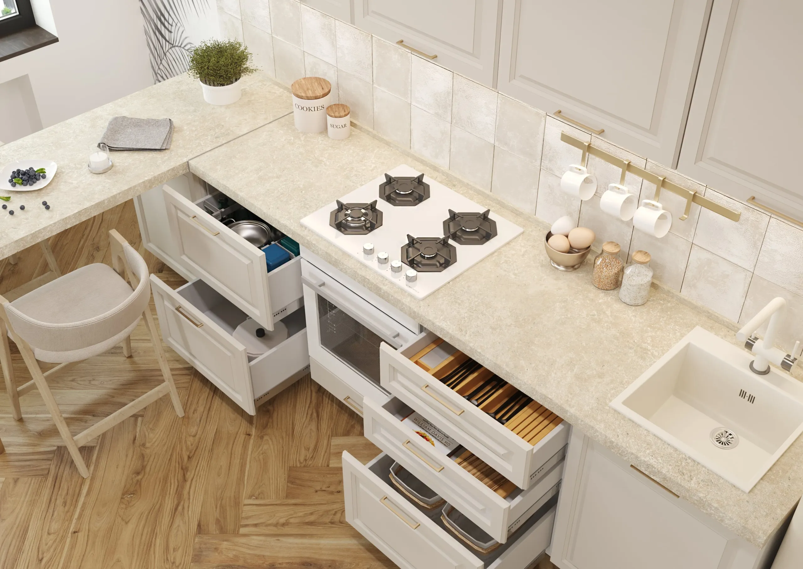 Механизмы открывания: петли BOYARD с доводчиком, направляющие Quadro 25 (Hettich)