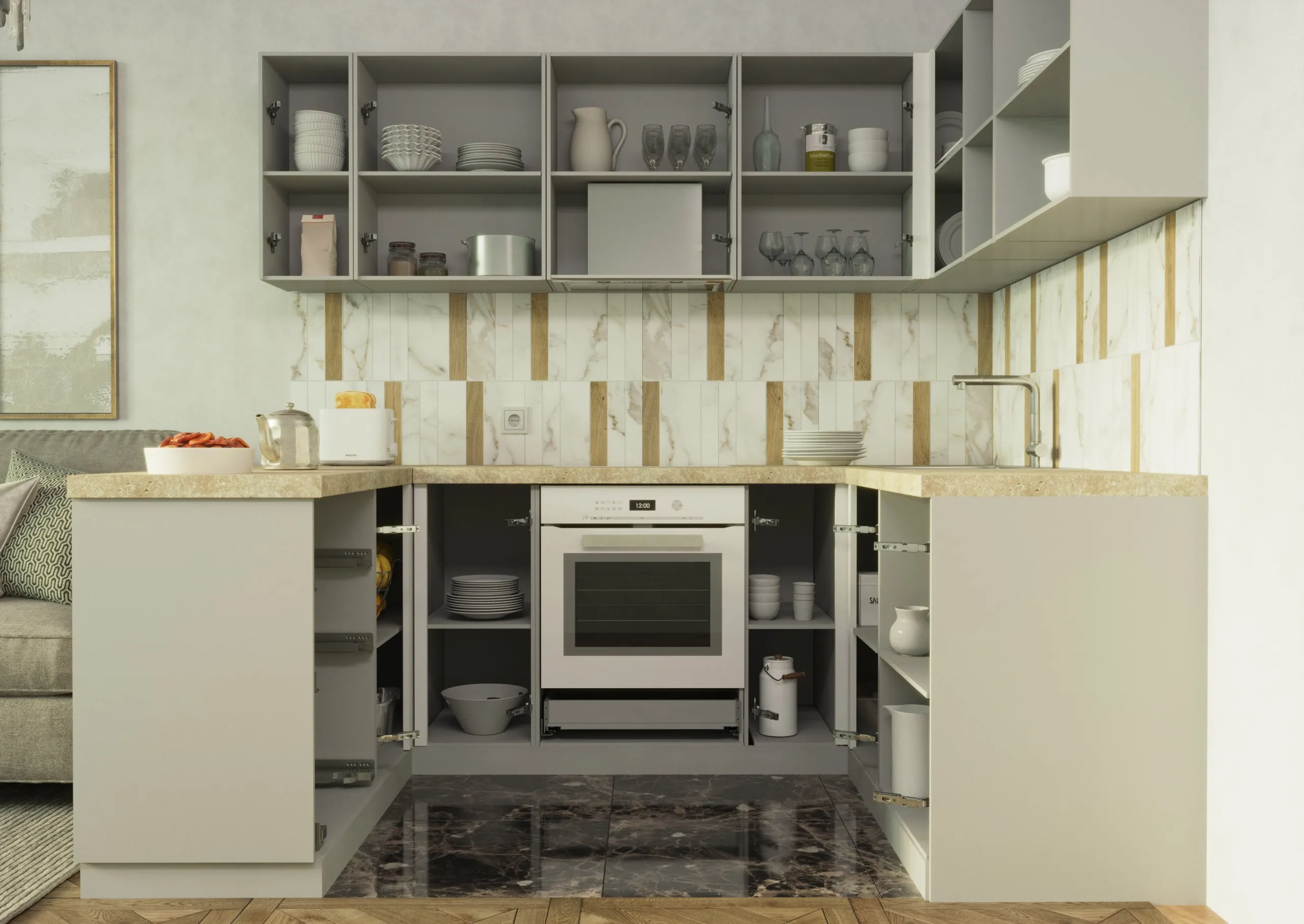 Механизмы открывания: петли BOYARD с доводчиком, направляющие Quadro 25 (Hettich)