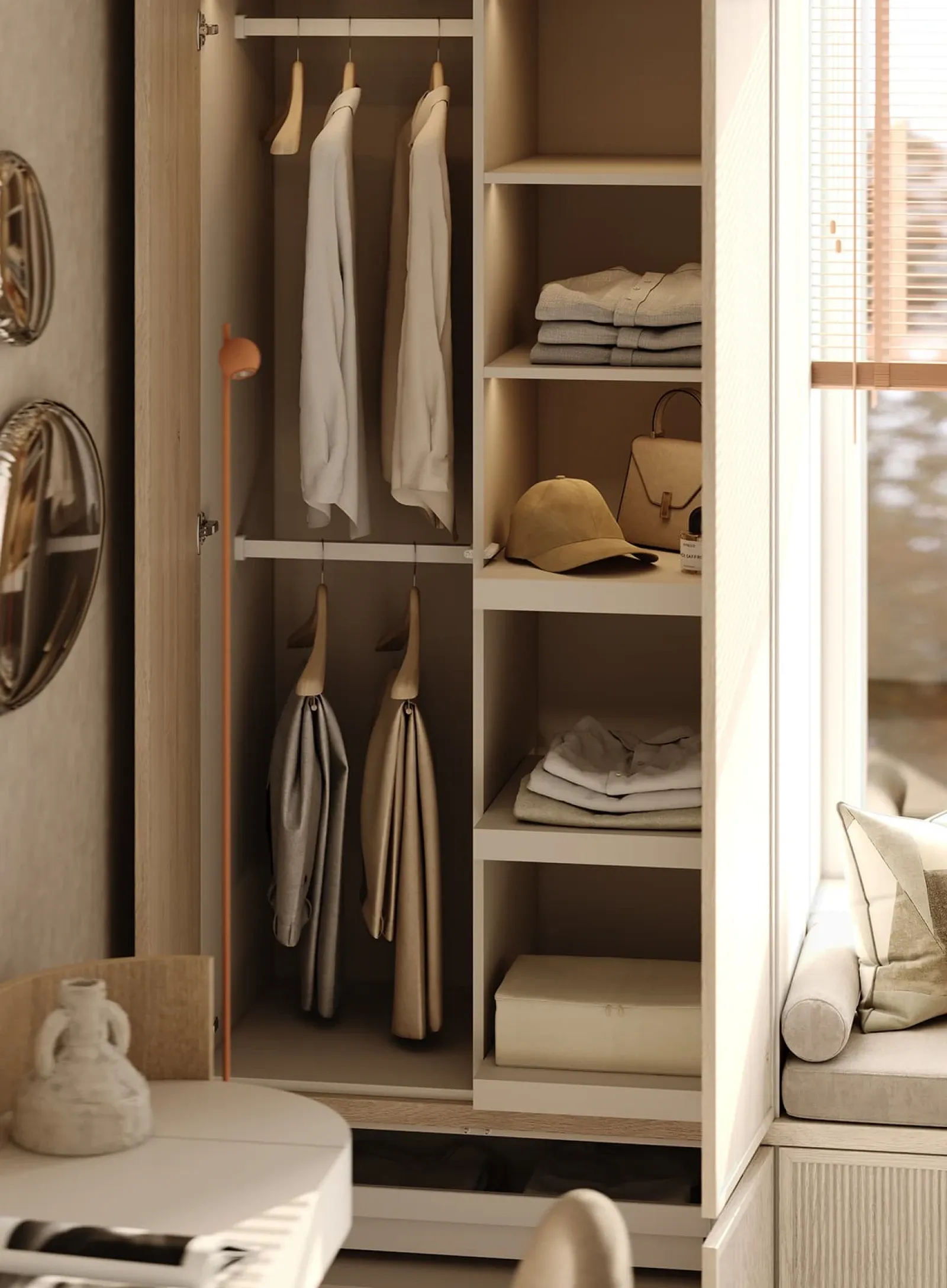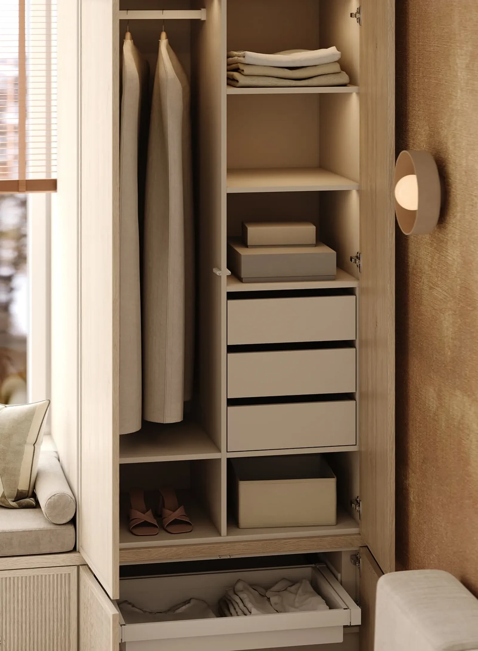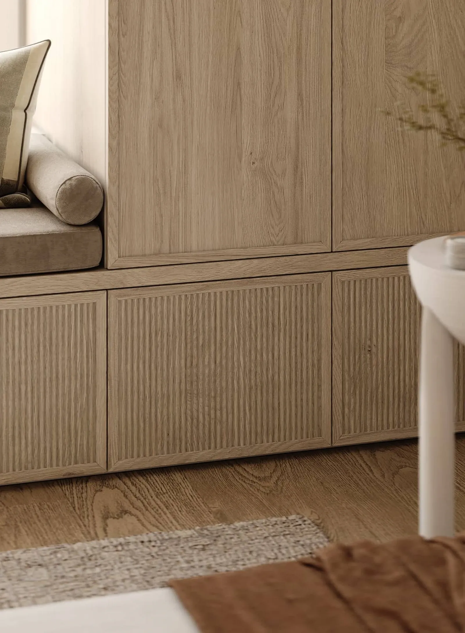 КАРКАС, ПОЛКИ, ВНУТРЕННИЕ ВЫДВИЖНЫЕ ЯЩИКИ, ЗАДНЯЯ СТЕНКА ЛДСП, цвет Белый Премиум / Белый ФАСАДЫ Т441, Т431В Массив дуба / шпон дуба, цвет #189 (воскобейц Белый)