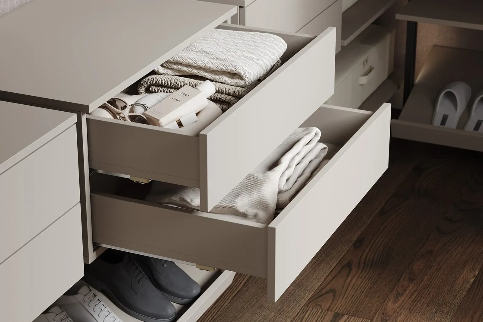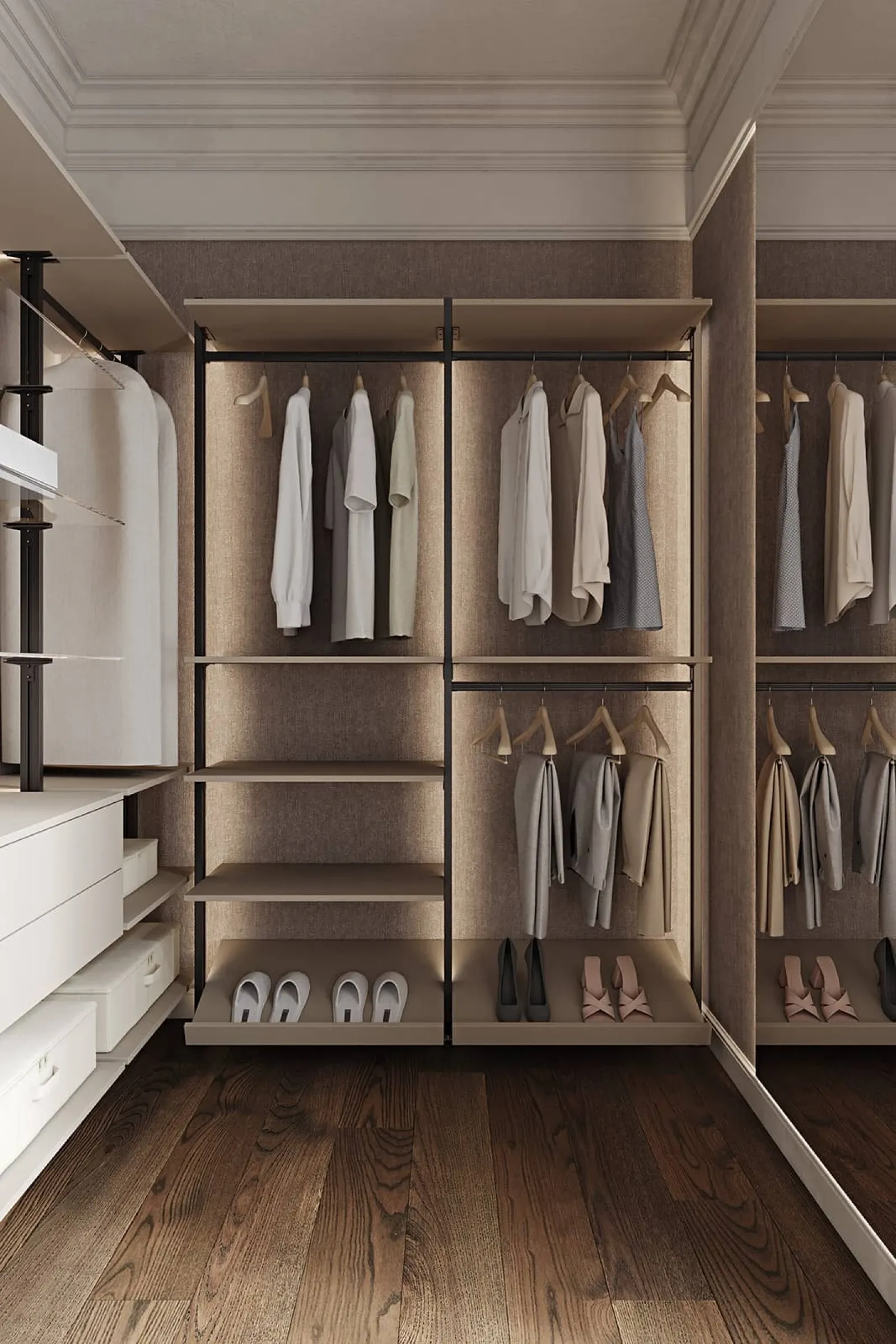 ОПОРНЫЙ ПРОФИЛЬ PA 02, цвет Черный Матовый НАВЕСНЫЕ ЭЛЕМЕНТЫ ЛДСП (толщина 18 мм), цвет Ярко-серый / стекло прозрачное (толщина 6 мм)