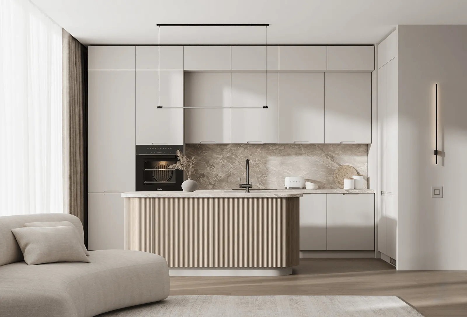 Фасады: ТТ622 Крашеная МДФ, цвет NCS S 1502-Y Матовый; T430 Массив дуба / шпон дуба, цвет #189 (воскобейц Белый).