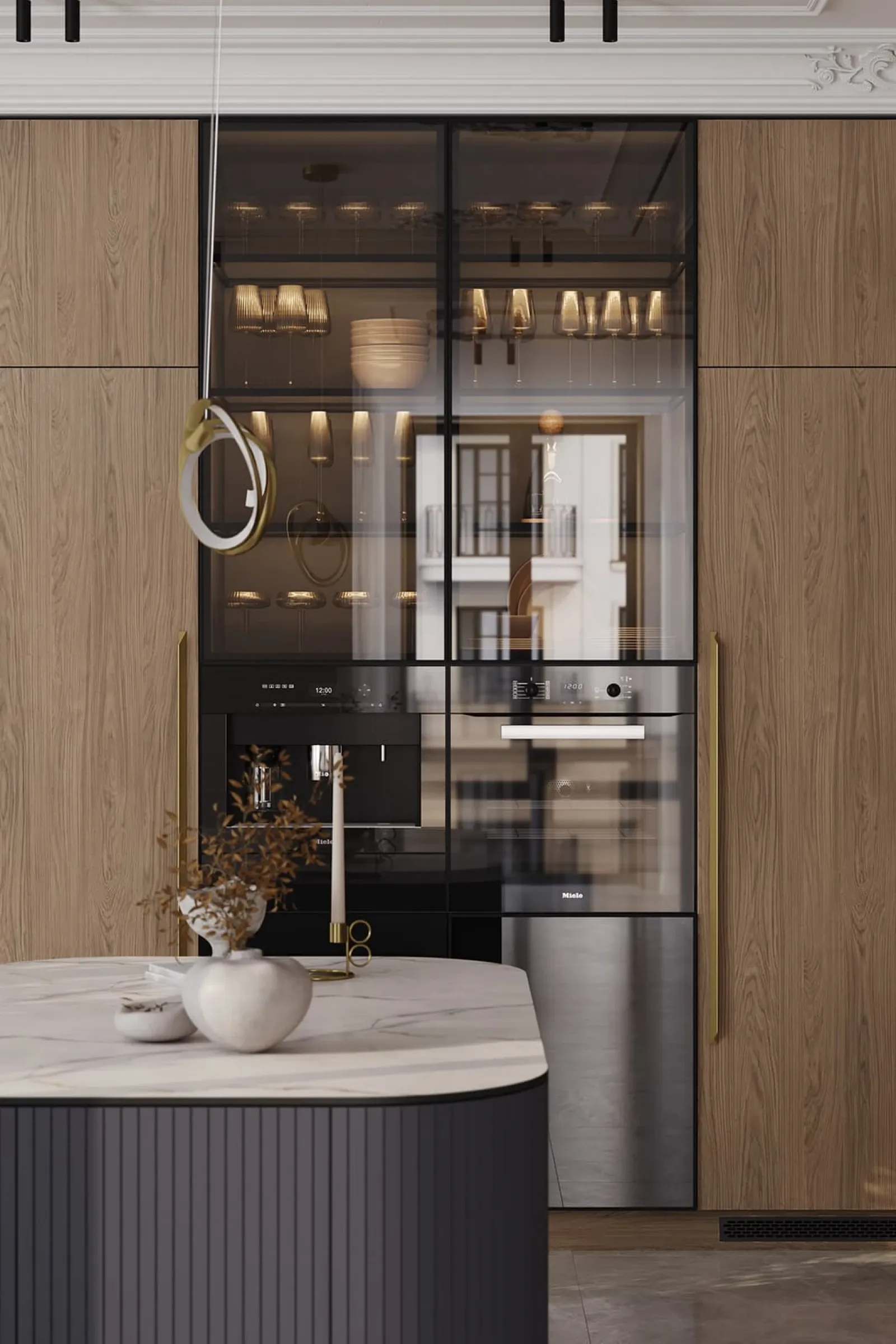 Фасады: ЛМДФ Тимбер, декор Каселла Коричневый / Аврора (крашеная МДФ), цвет NCS S 6010-R90B Матовый / крашеная МДФ, цвет NCS S 6010-R90B Матовый / NCS S 2000-N Матовый