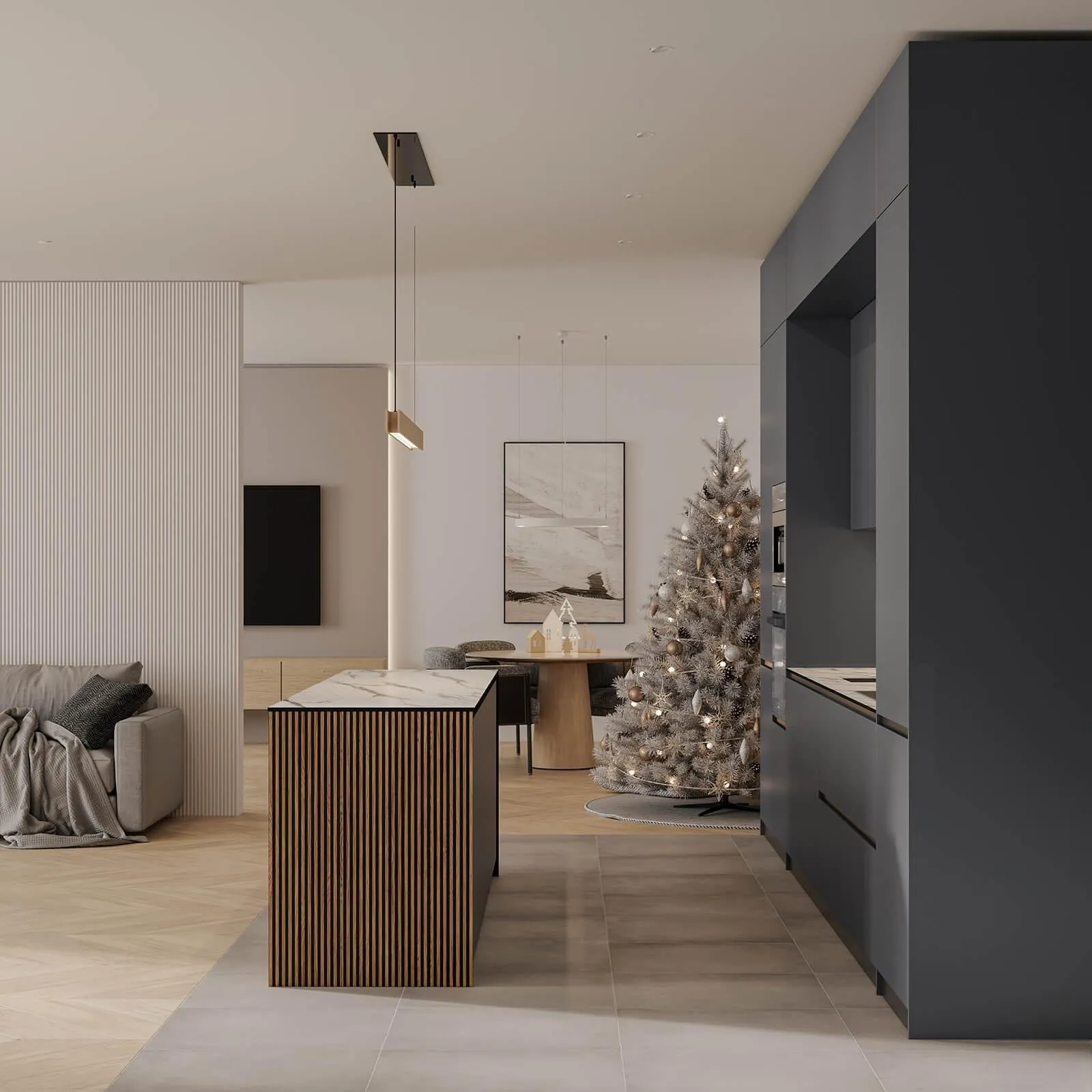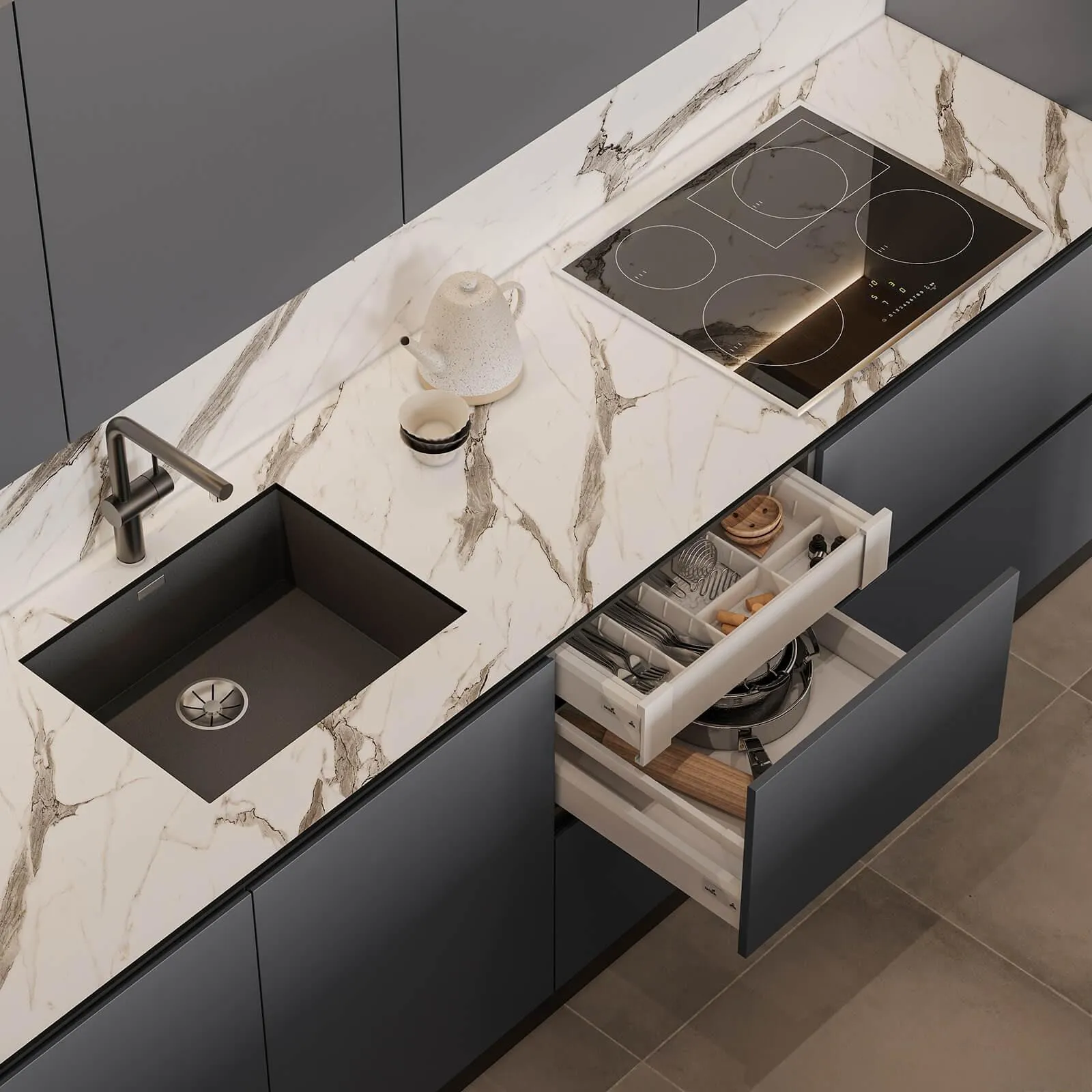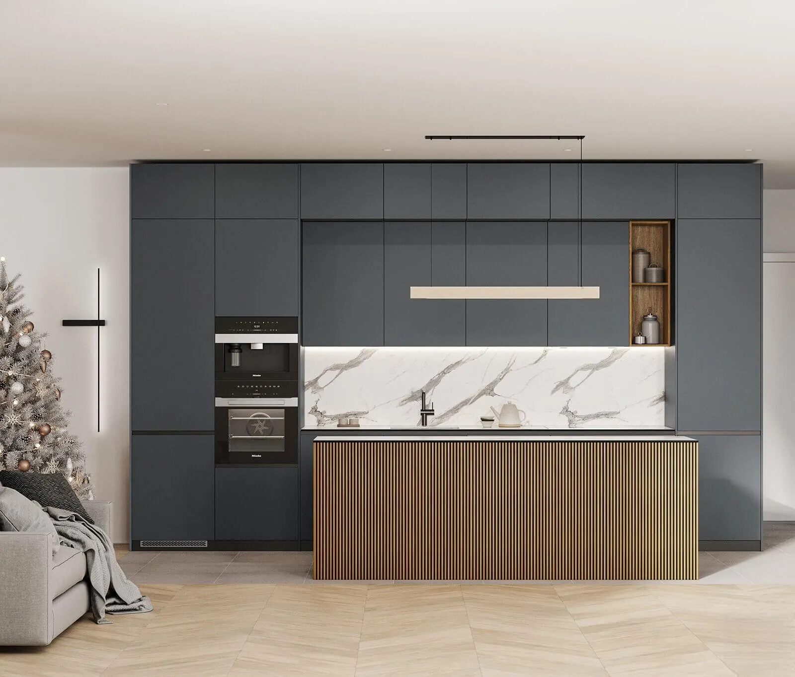 Фасады: T234 МДФ / шпон ясеня, цвет #111 Черная патина / акрил Fenix NTM, цвет Серо-синий NTM (0724)
