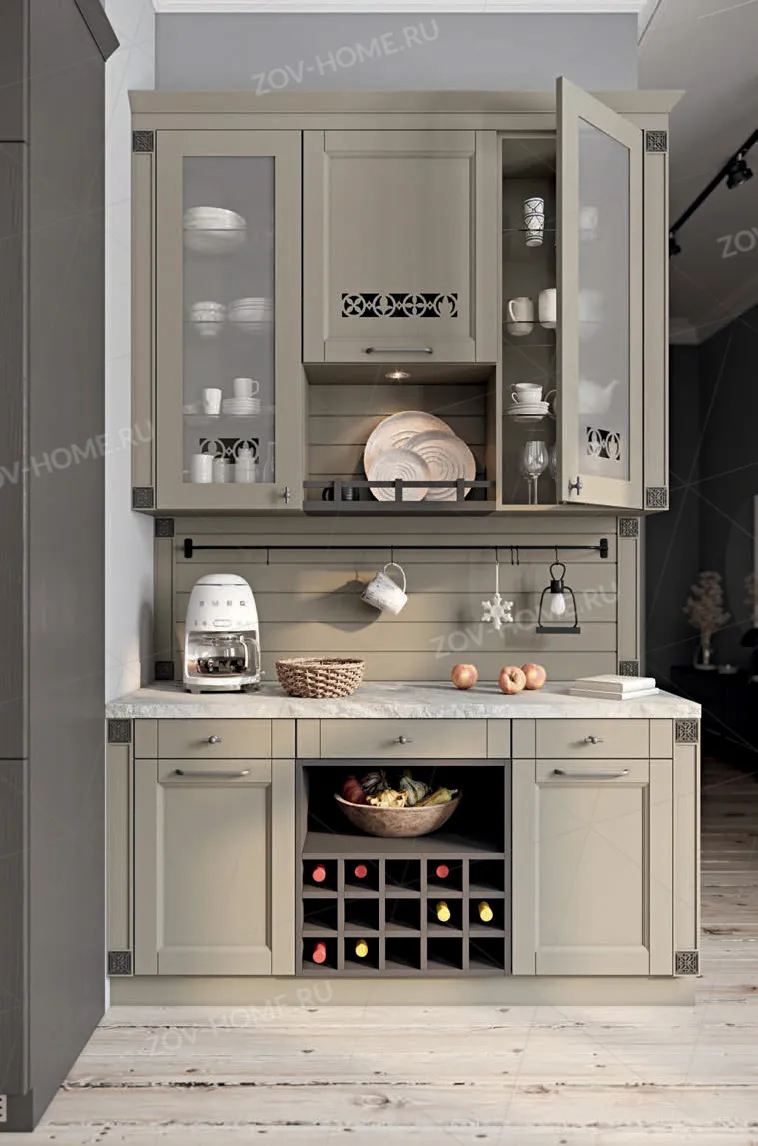 Декоративные элементы: Опора декоративная ОД-10 (820), цвет вставки 120; панель декоративная БПД-10-1; пилястра #13, цвет вставки 120; балюстрада прямая «Техно»; плинтус мебельный ПМ-5; багет ЛГБ-1 прямой; вагонка, цвет NCS S 6005-G80Y; декоративный короб HB «Пьемонт» (900) под встраиваемую вытяжку, цвет купола / вставки 120