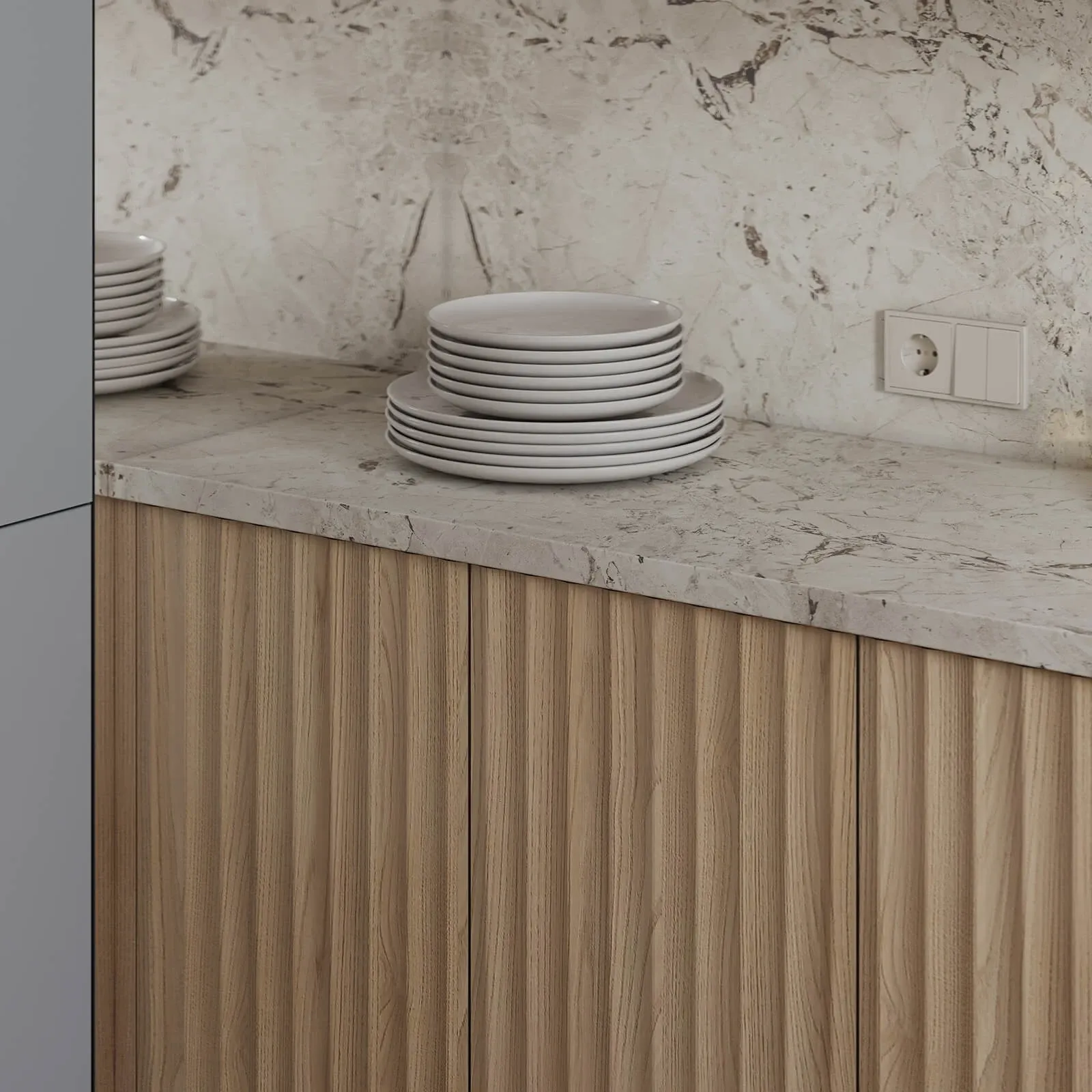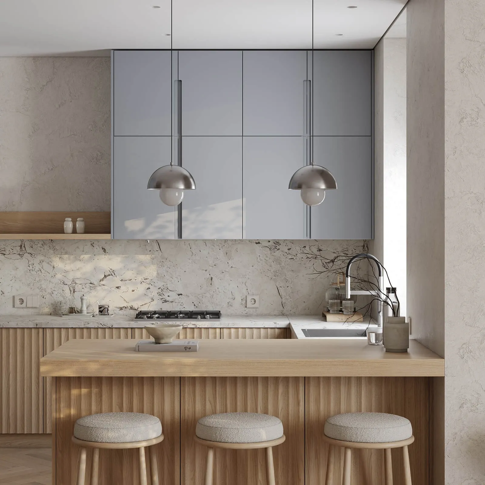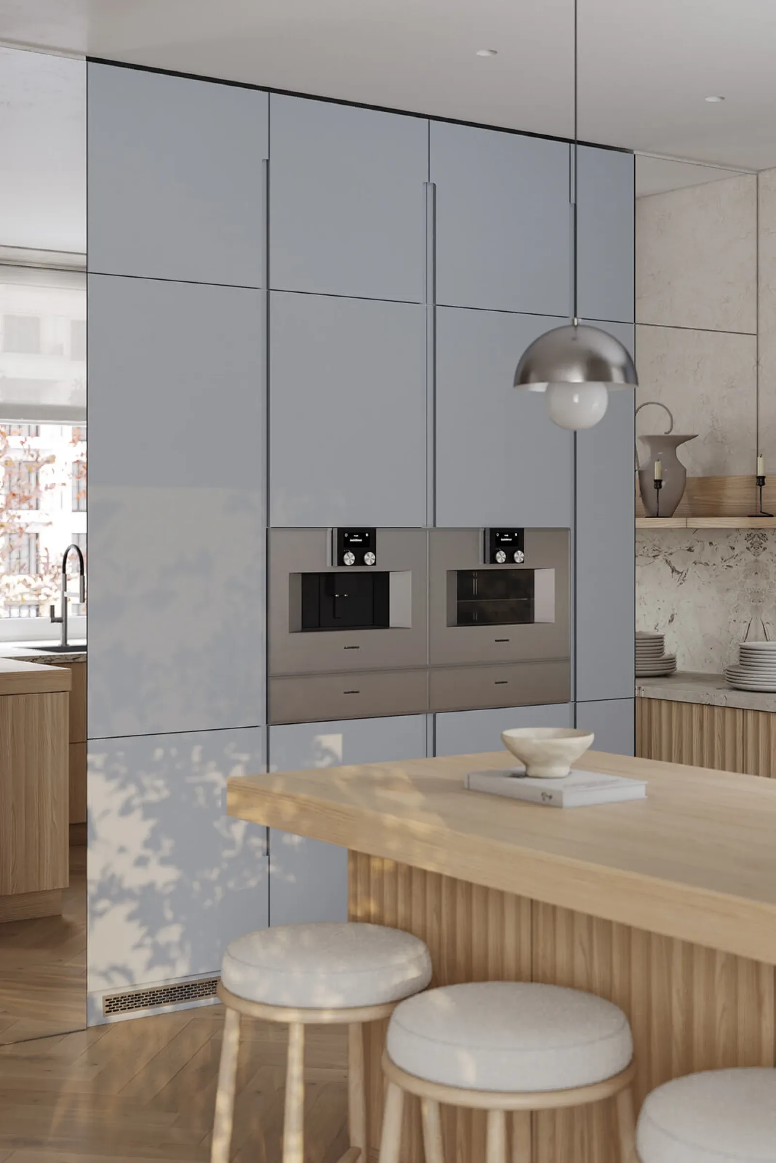 Фасады: T443 Шпон дуба, цвет #189 (воскобейц Белый) / Т622 Крашеная МДФ, цвет NCS S 2010-R90B Матовый