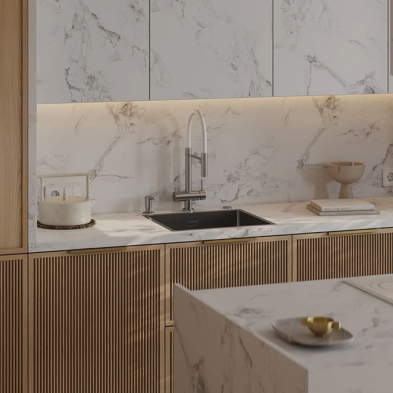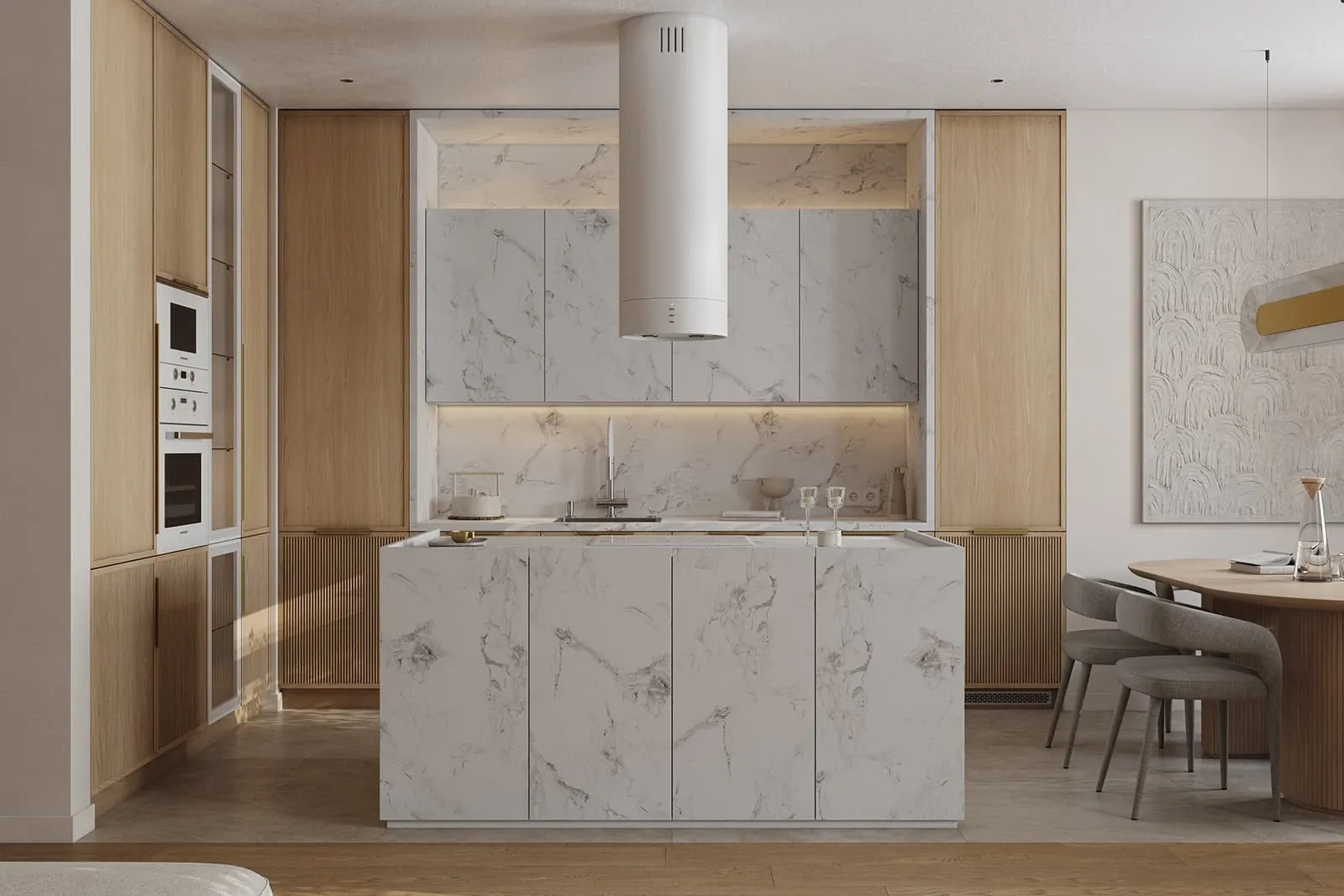 Фасады: Т431В / Т441 Шпон дуба, цвет #183 (масловоск Бесцветный) / пластик HPL Möbius Soft Touch, декор Мрамор Бернини