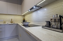 Техника: мойка и смеситель - EMAR, измельчитель - BONE CRUSHER, встроенный духовой шкаф, встроенная электрическая варочная панель, встроенная СВЧ, встроенная вытяжка, встроенная ПММ, встроенный холодильник - KORTING