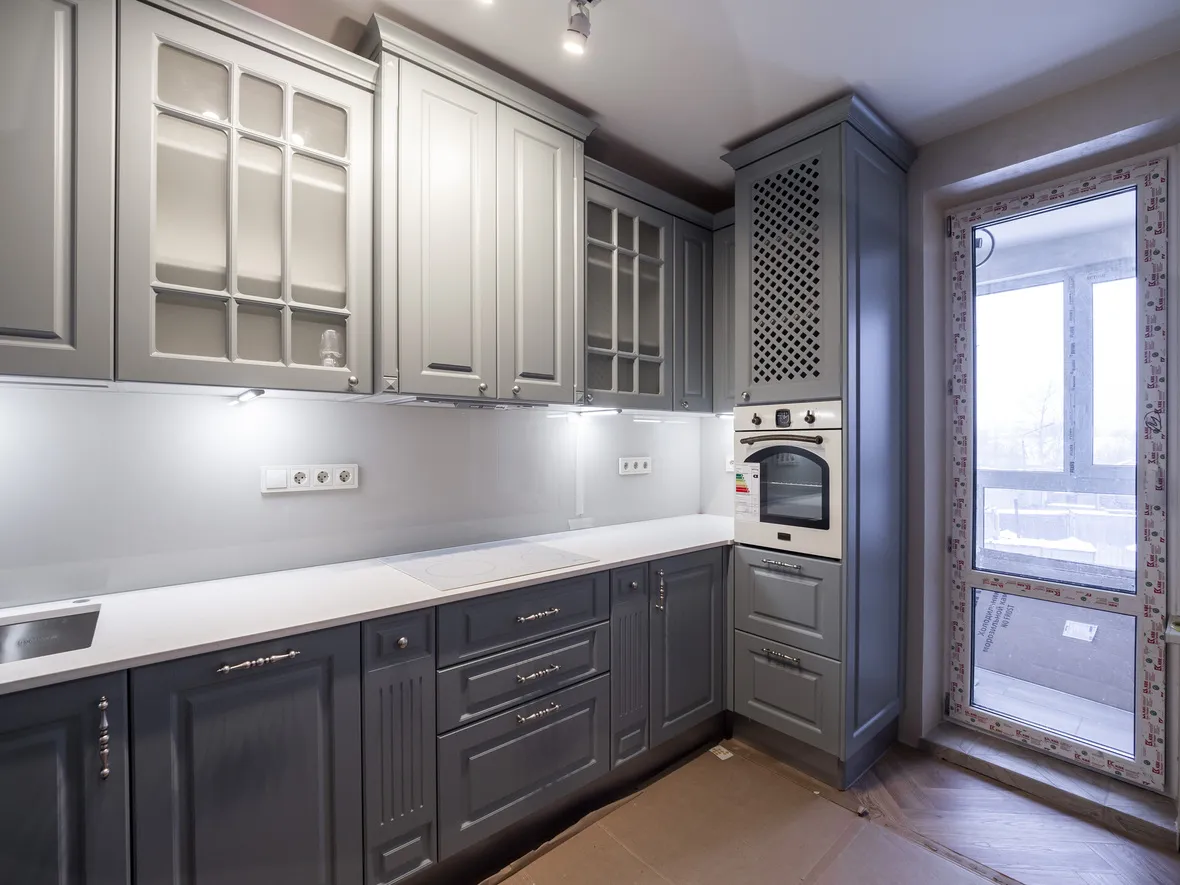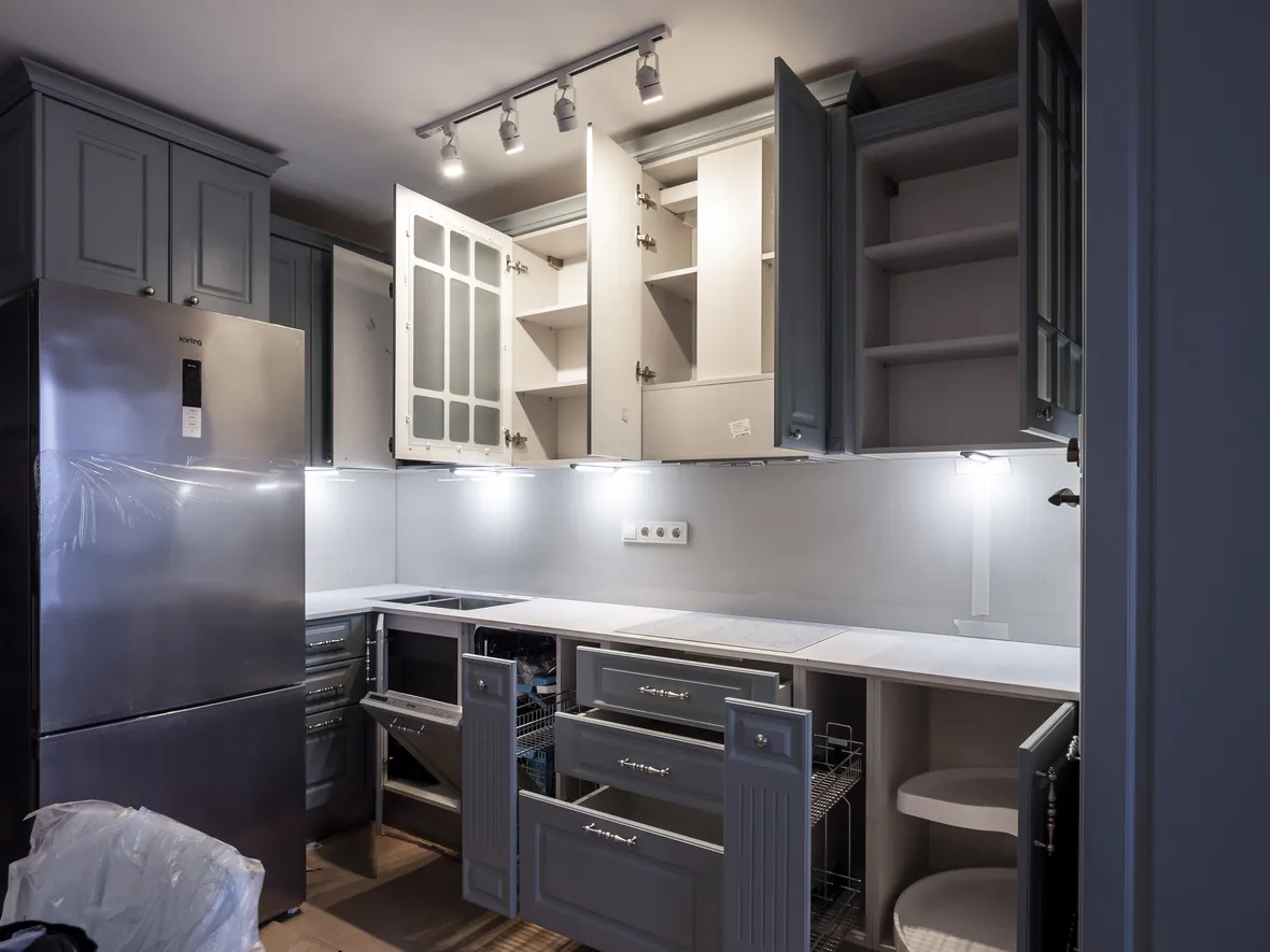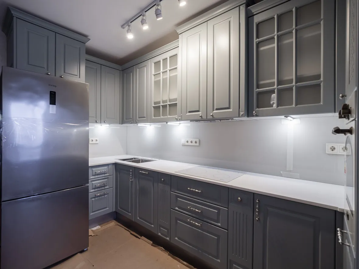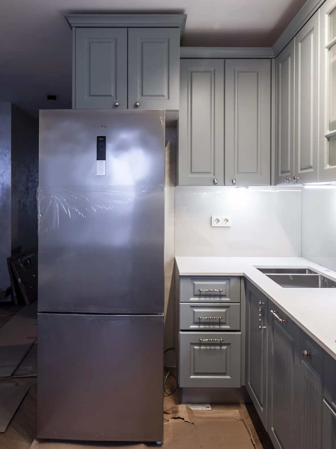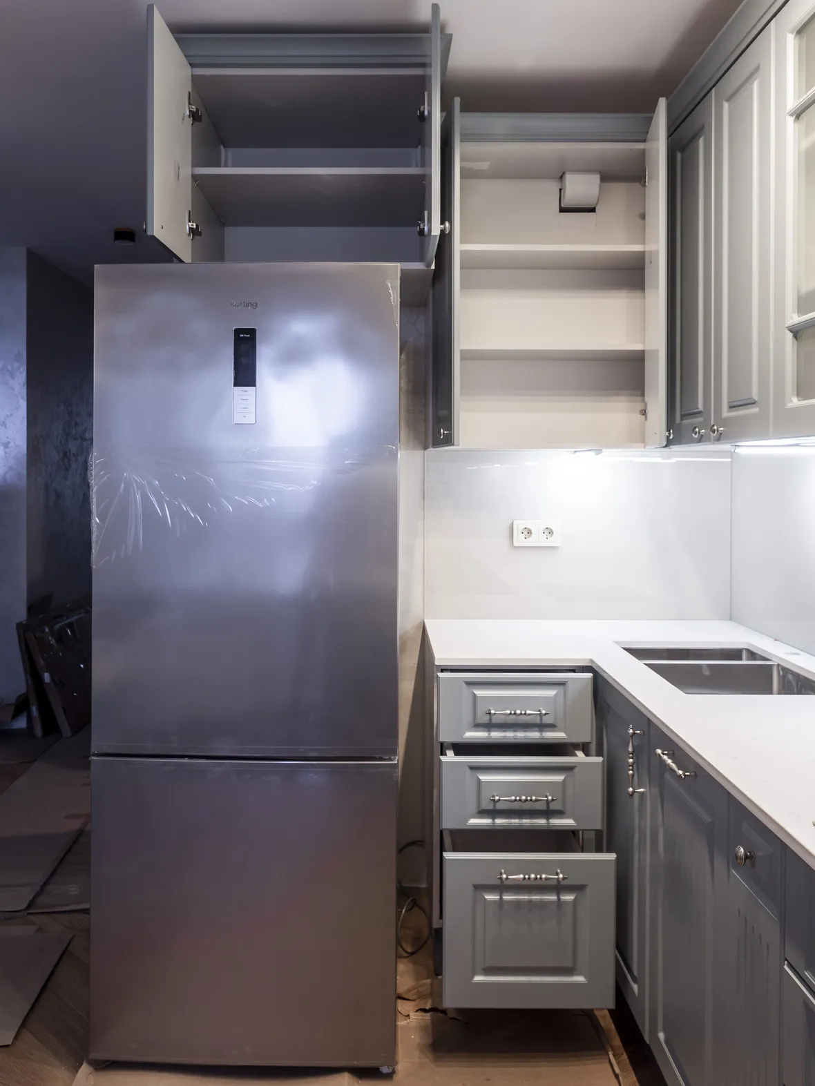Техника: электрический духовой шкаф, индукционная варочная панель, полновстраиваемая вытяжка, ПММ, холодильник - KORTING, мойка, смеситель и дозатор - OMOIKIRI, измельчитель - BONE CRUSHER