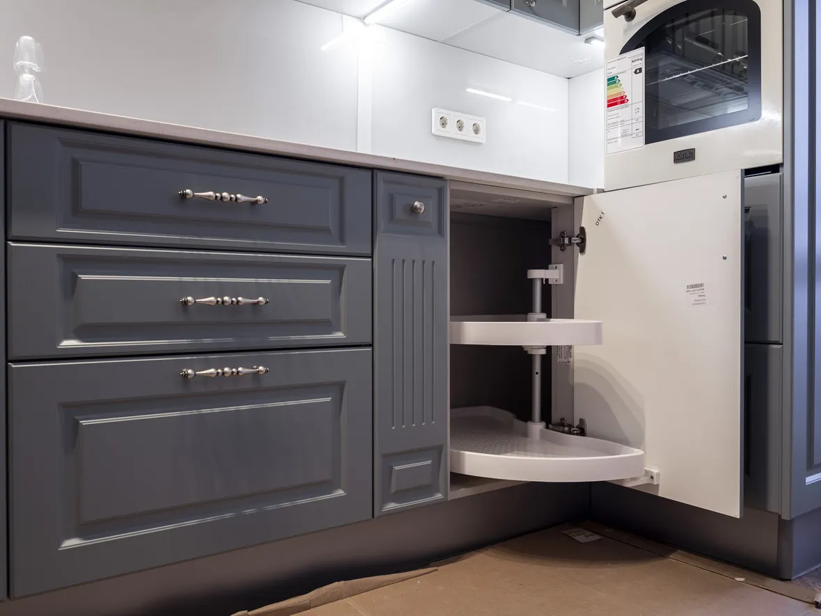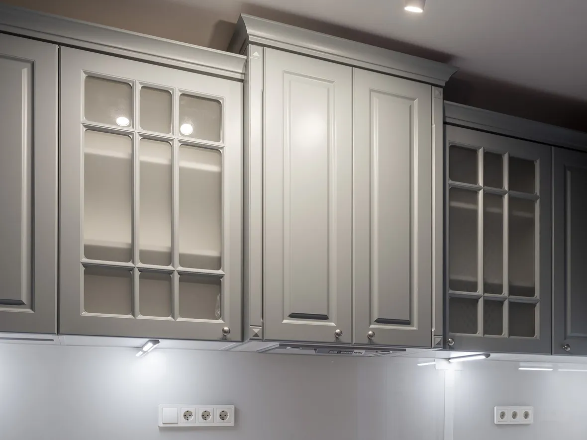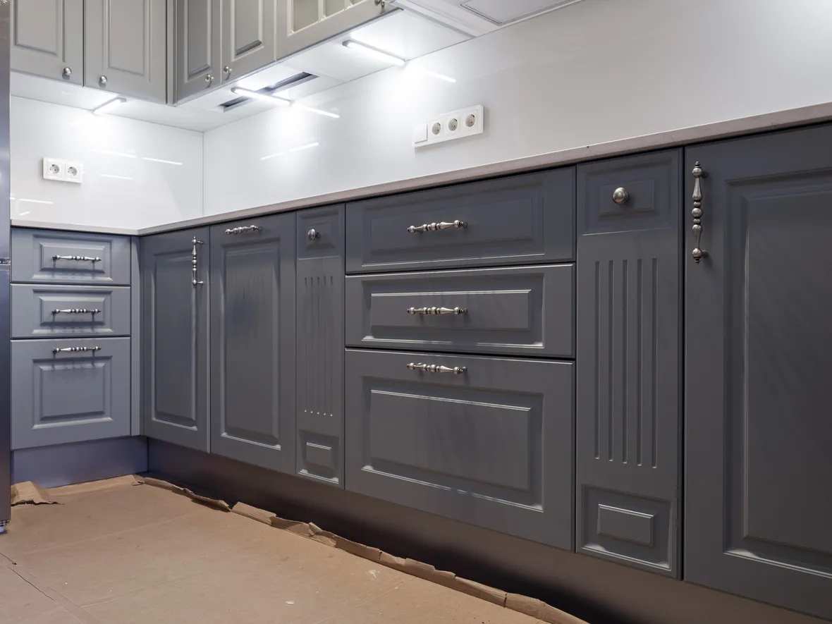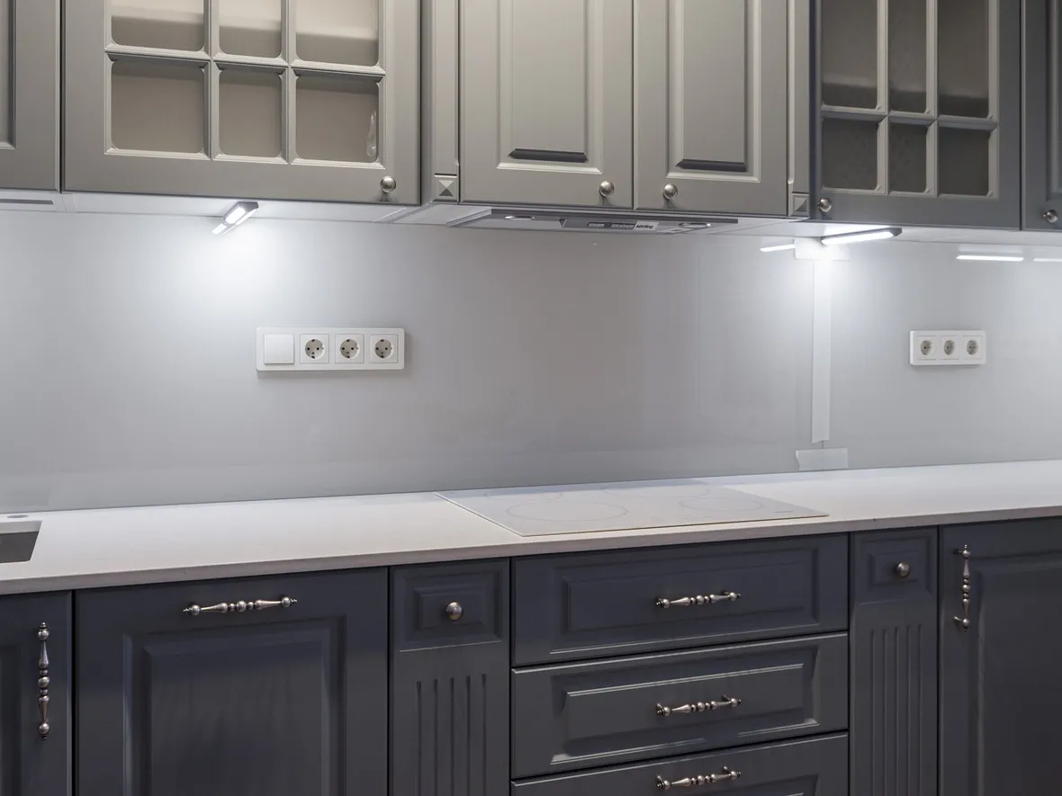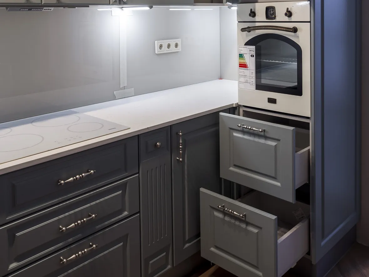Техника: электрический духовой шкаф, индукционная варочная панель, полновстраиваемая вытяжка, ПММ, холодильник - KORTING, мойка, смеситель и дозатор - OMOIKIRI, измельчитель - BONE CRUSHER